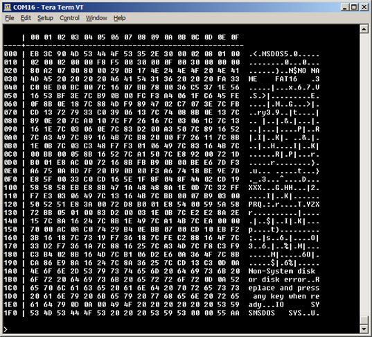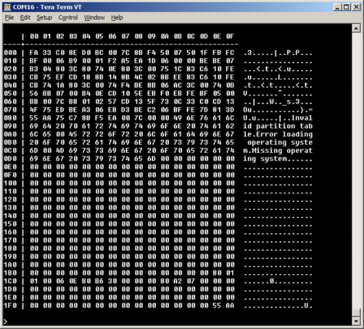 Setting the LBA registers to 0x00000000, I read the sector into my buffer and here is what I got: