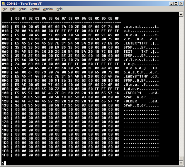 If the first byte of the filename in the directory is 0xE5 this signifies that the file was deleted, hence the reason why there are 10 entries but only 2 items are showing. (Side note: If we change the 0xE5 character in the deleted filenames to some other printable ASCII character, we “undelete” the file. It’s only readable if its data hasn’t been overwritten.)