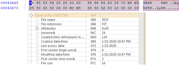 The value we are interested in here is “First cluster (low word)”; the high word counterpart is not relevant in FAT12 and FAT16. We take this value and subtract 2 (it’s a quirk of FAT that it starts at 2 rather than 0). The value is 0x0002 after subtracting 2 so it is now 0x0000.